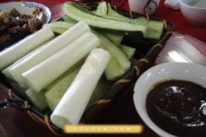 大葱蘸酱,又名大葱蘸豆瓣酱,潍坊特色菜肴。要求生吃大葱最好的是靠近跟部的葱白,豆瓣酱应为咸酱而非甜酱。因主产于潍坊市坊子区得名。 在潍坊做豆酱一般在春天。首先黄...