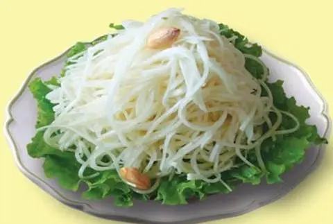 诸城辣丝子是山东省诸城市民间流传的一种具有乡土风味的凉菜。在冬季、春节凉菜中堪称一绝,尤其春节期间,人们走亲访友,酒宴频接,荤味多多,加一辣丝,备受欢迎。按诸城人的传统习惯,春节待客,筵席再丰盛,若没有辣丝子这道凉菜,就算缺少了一大风味。