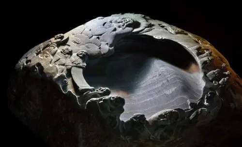 鼍矶石含有微量自然铜,如金屑撒石上,闪耀发光,即所谓金星。色青黑,略呈绀青、灰绿色,有明度不同雪浪纹,小如秋水微波,大如雪浪滚滚,着水似欲浮动,映日泛贝光,故名金星雪浪。