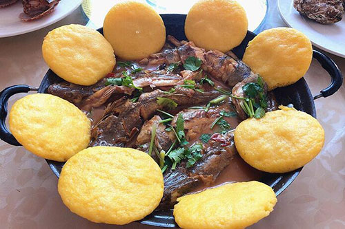 后来,苞米面饼子就咸鱼被更多的海边人所接纳,于是渐渐走上街头,成为著名小吃。 咸鱼饼子从当地农村流入城市,现在所有小馆子大饭店都吃得上。鱼是秋天的海鱼,有棒鱼也有黄花,巴掌长,放了姜葱盐腌,腌好了用油煎的焦黄。饼子是陈年的苞谷面掺了豆面白面发出的,把大锅烧上水,饼子贴在锅四周。