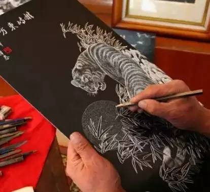 锲金画是金属錾刻艺术中独特的艺术门类,它以刀代笔,以刀錾施艺于金、银、铜、铝等金属板上,通过落刀的角度、轻重、深浅的变化而产生不同的折光效果,在不同角度都有立体艺术效果。