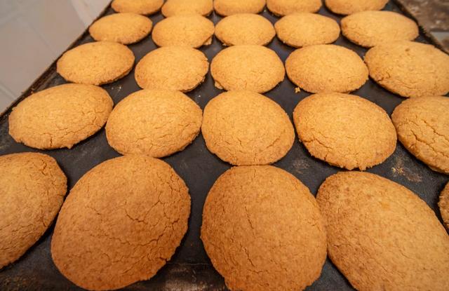 增聚烩饼制作时,应将头遍面(精面粉)、纯正的甘蔗糖按一定比例调匀,上锅蒸熟,凉透,用细箩筛好,然后用自家压榨的花生油和面,放到木头模具里制作好花纹和定型,最后放到炉上烤制。那时用的是土炉,炉口小,仅能填入很细的柴禾,可能是为了保温和控制火势。灶是用黄土打造成的,火道弯曲迂回,主要是为了受热均匀。上面是厚厚的铁篦子,专门用来烤制回饼。制作回饼的火候很重要,烧火不能心急,火急了回饼就会有糊边,前功尽弃,不仅卖不出去,还可能坏了老字号的名声。