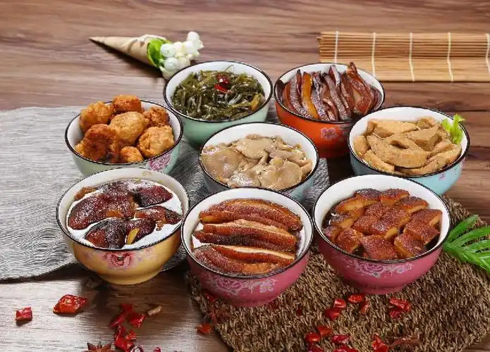 满族八大碗由雪菜炒小豆腐、卤虾豆腐蛋、扒猪手、灼田鸡 、小鸡珍蘑粉、年猪烩菜 、御府椿鱼、阿玛尊肉等八种菜组成。