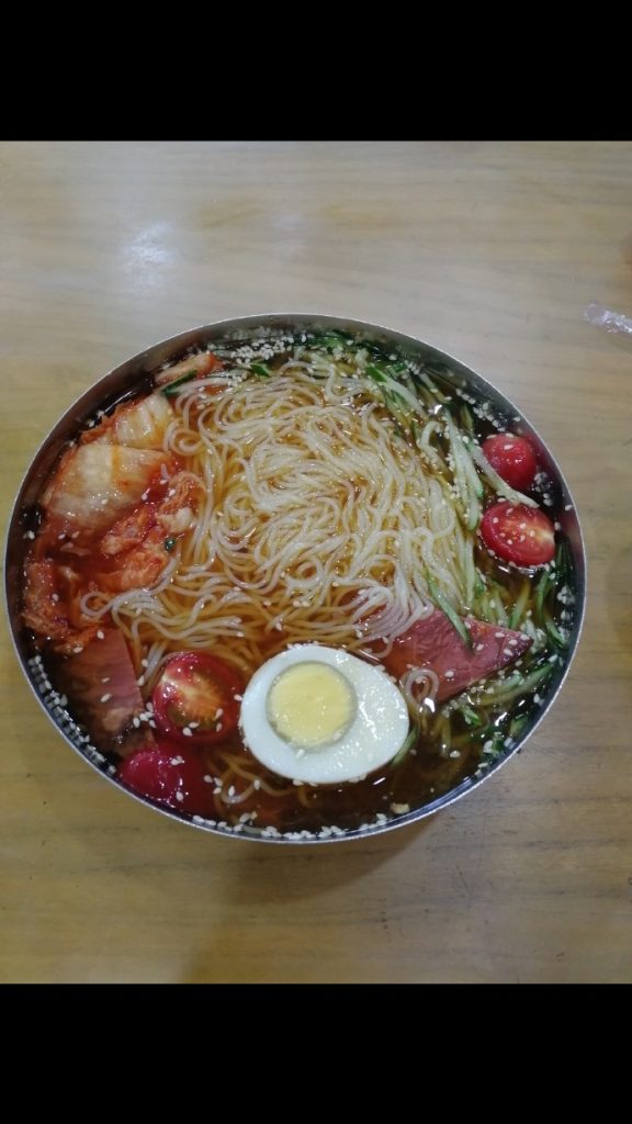 朝鲜族冷面是中国东北地区著名小吃。以它独特的风味闻名中外。主要原料有荞麦粉、小麦面和淀粉,也有用玉米面、高粱米面和士豆淀粉的。加以牛肉汤或鸡肉汤,然后在面条上放一些胡椒、辣椒、牛肉片、鸡蛋、苹果片、香油等调料。