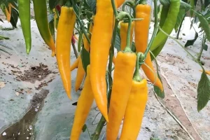 寿光羊角黄辣椒,寿光市特产,全国农产品地理标志保护产品。因椒果形似羊角,故名羊角椒。因主产于寿光市得名。  寿光羊角黄辣椒生长势强,叶片披针形,果实呈羊角形,商...