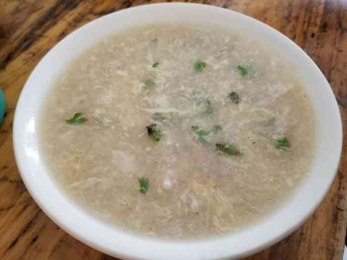 糁。音san,迄今已有2400余年的历史。《礼记·内则》载:“糁,取牛、羊、豕之肉,三如一,小切之,与稻米二,肉一,合一为饵,煎之”。糁这种吃食非常流行,多用鸡肉(或牛、羊肉)和麦仁、面粉、葱、姜、盐、胡椒粉、五香粉、香油、酱醋等原料,经多道工序制成,汤稠味浓,讲究“热、辣、香、肥”,无论在街边小摊还是在大酒店里都能喝上。