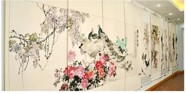 仿古国画分纸本、绢本、装裱3种,题材以山水、花鸟、人物为多。1974—1978年产品全部出口。1978年以后,转向绢面国画屏风生产,品种有四扇屏、六扇坐屏、台屏等。1982年潍坊工艺美术研究所又创鎏金填彩屏,并于1986年获中国工艺美术品百花奖优质产品奖。