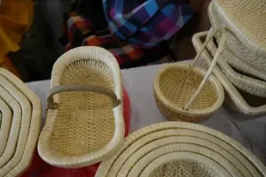 虎头鞋,高密市著名民间工艺品,因鞋头呈虎头模样,故称虎头鞋。 虎头鞋做工复杂,仅虎头上就需用刺绣、拨花、打籽等多种针法。鞋面的颜色以红、黄为主,虎嘴、眉毛、鼻、...