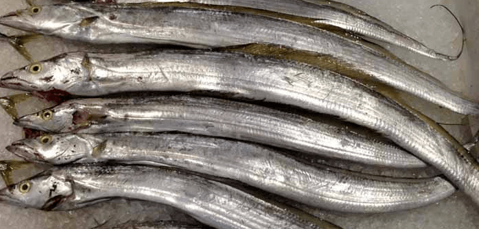 带鱼,又叫裙带、肥带、油带、牙带鱼等。带鱼的体型侧扁如带,呈银灰色,背鳍及胸鳍浅灰色,带有很细小的斑点,尾巴呈黑色,带鱼头尖口大,至尾部逐渐变细,全长1米左右。性凶猛,主要以毛虾、乌贼为食。