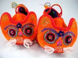 即墨虎头鞋做工复杂,仅虎头上就需用刺绣、拨花、打籽等多种针法。鞋面的颜色以红、黄为主,虎嘴、眉毛、鼻、眼等处常采用粗线条勾勒,夸张地表现虎的威猛。民间制做此鞋时,还常用兔毛将鞋口。虎耳、虎眼等镶边,红、黄。白间杂,轮廓清晰。孩子穿上虎头鞋唇,兔毛随风飘动,虎头也有了动感。虎头鞋鞋底肥大,插空纳上九个菱形破花,九个破花称为九颗圆子,意为“九子十成”。穿虎头鞋的时间,是在幼童一岁左右。此时的儿童跃跃欲试,想要走路,但又离不开大人的搀扶。这时父母给孩子穿双虎头鞋。利于孩子脚踏实地。更重要的原因,是人们认为虎是百兽之王,穿。上虎头鞋可以辟邪恶保平安,护情孩子健康成人。