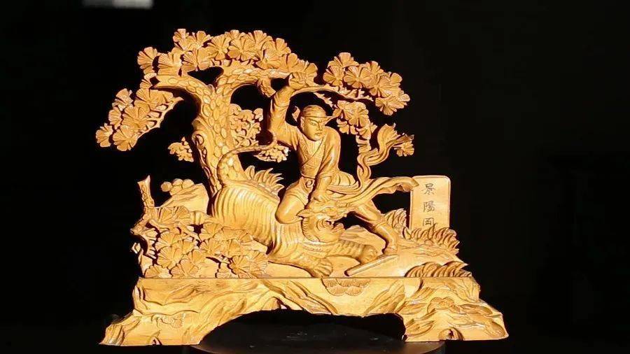 其次为黄杨木半浮雕装饰品。以“八仙过海”、“武松打虎”等历史故事为背景,构思巧妙,刀工精细。